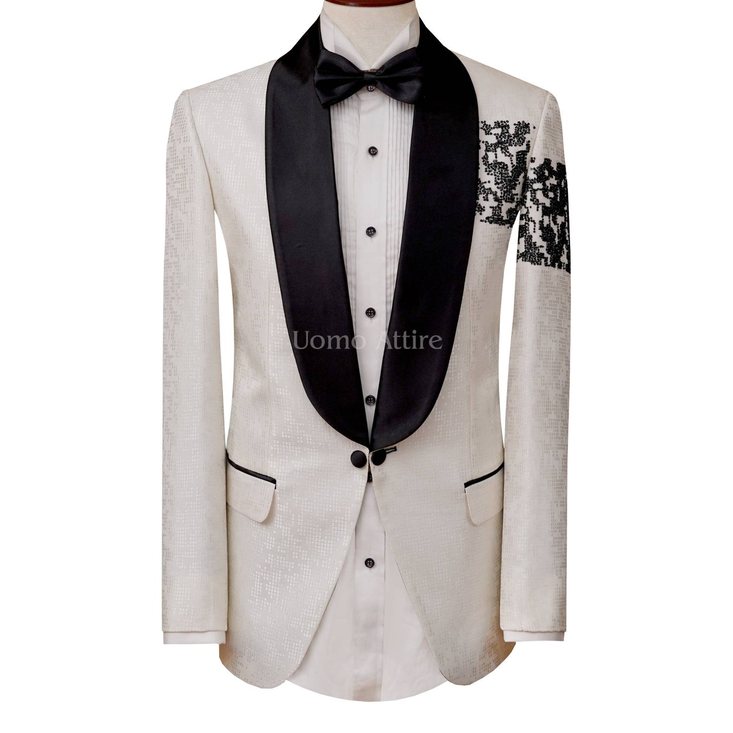 Bespoke tuxedo 3 piece suit in self embossed textured fabric, tuxedo suit, jamawar tuxedo suit | Tuxedo Suit