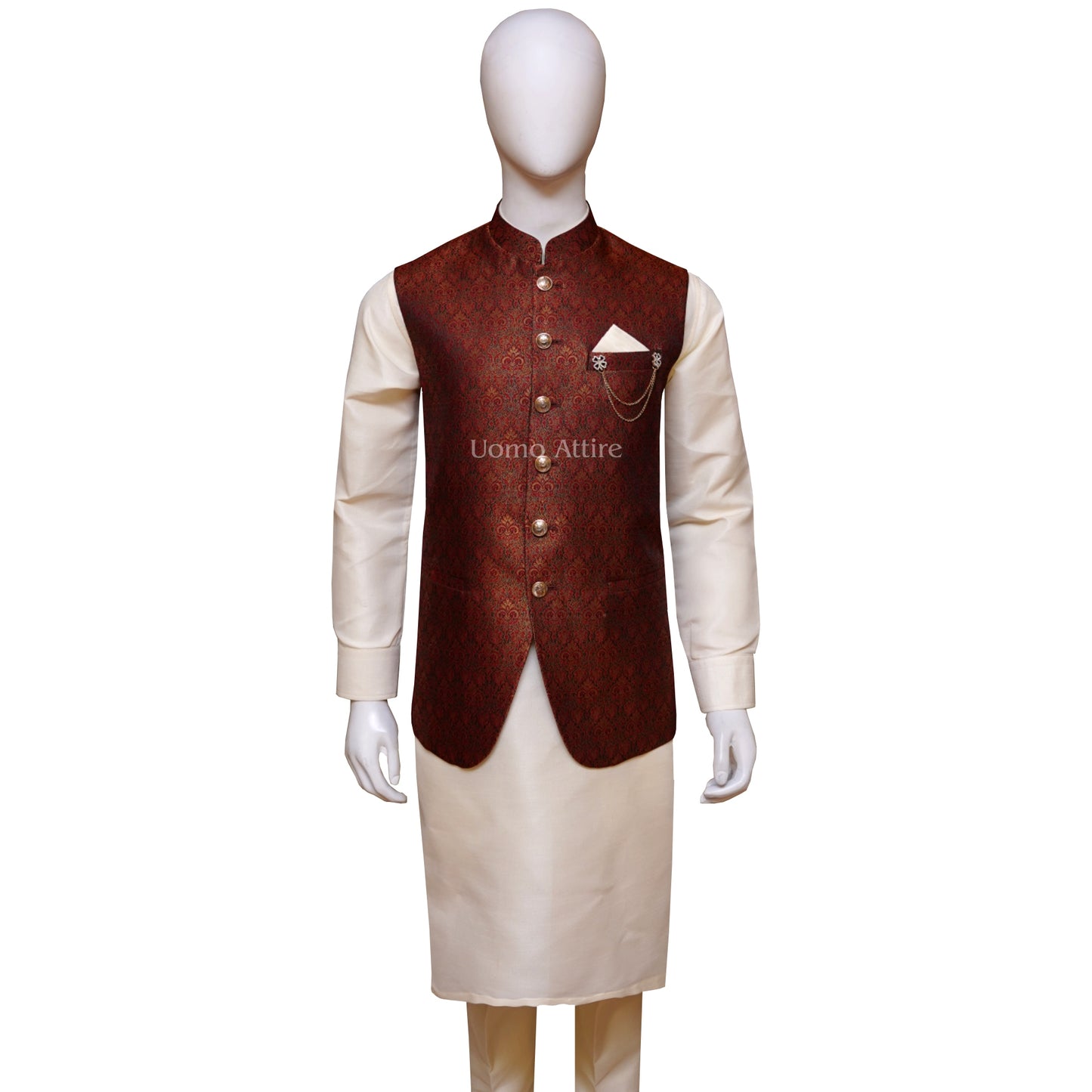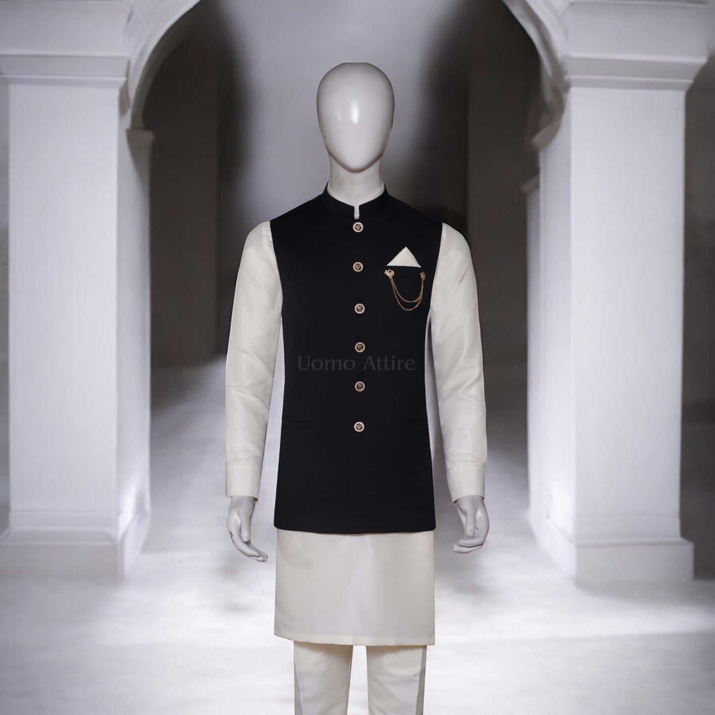 Distingui il tuo stile aggiungendo un panciotto al tuo vestito. Alla ricerca di un capo di abbigliamento perfetto per aggiungere sicurezza e grazia a un abbigliamento. I gilet sono un modo sicuro per elevare la tua semplicità Shalwar Kamez . Ottieni il tuo personale gilet personalizzabili in esclusiva da Uomo Attire, con Gilet Awami disegni in tessuti Jamawar e Tropical con tagli e stili premium.